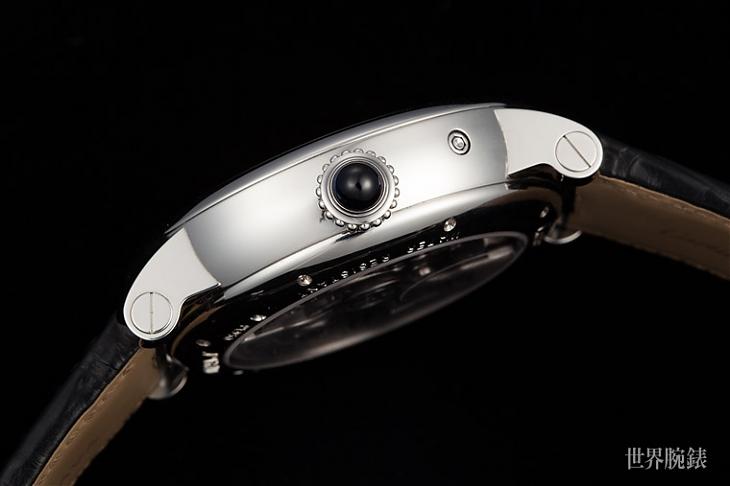 實用和美學兩相結合才是好設計,這句話在這款天體萬年曆身上更可以完整體現。9459 MC機芯包含了卡地亞很多專利技術,譬如防止錶友在午夜前後手動調校時間的自動上鎖機制,因為9459 MC機芯的齒輪系統一共有19枚零件,但卡地亞以專利技術研發出一款防斷裂的齒輪組,取代了傳統的離合杆和發條彈簧。另外隱藏在錶側兩點鐘的小按把可以直接快調月份,錶冠則可以直接調整日期,震頻21,600vph,在操作上可說是相當容易上手。