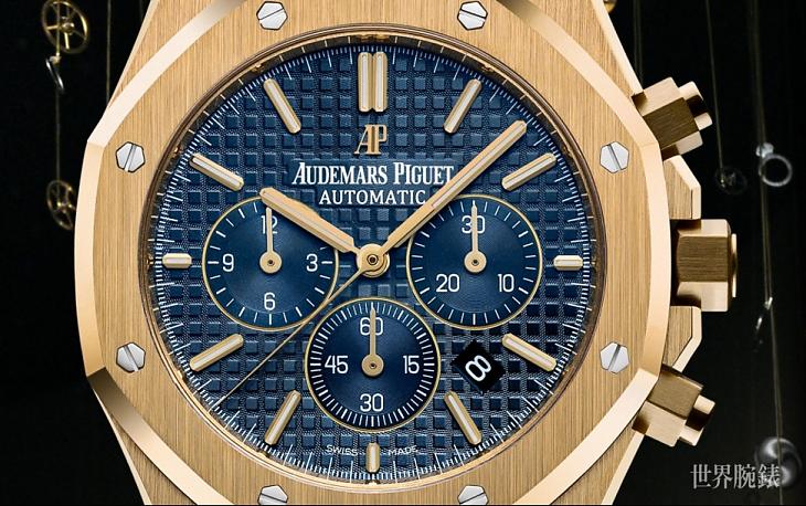 在錶盤部份,4點鐘位置設有日期視窗,6點鐘位置則設有小秒盤。錶盤與三個副錶盤皆以藍色為基調,並搭配黃金螢光立體時標和皇家橡樹指針,呈現出深邃典雅的風格。而且它的錶盤也鎸刻著愛彼經典的Grande Tapisserie大格紋裝飾。它那皇家橡樹經典的八角形錶圈上也鑲嵌八個六角形螺釘,將皇家橡樹血統展演的淋漓盡致。綜上所述,這只以18K金打造的皇家橡樹計時碼錶,於不敗經典中刻畫出一場不凡的風度與高度,讓人不心動都難。