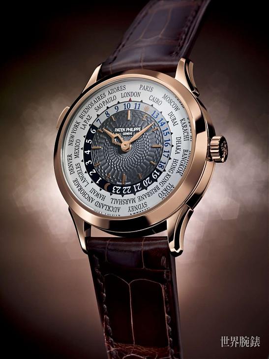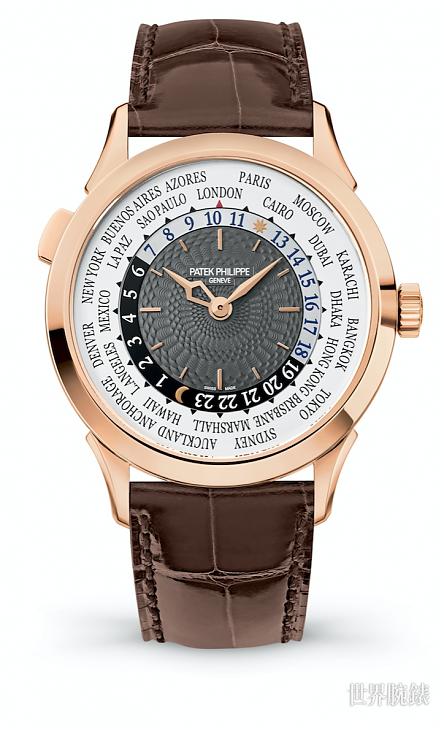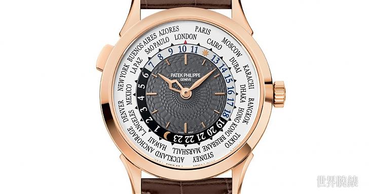 錶盤部份,Ref.5230R的指針採用了全新造型,以「南十字星」造型的鏤空時針和菱形輪廓分針取代過去的環狀時針及太妃分針。而兩枚指針在兩側精緻的倒角邊緣之間也有一個尖銳的中心突起,它們和棒狀立體時標均採用與錶殼相同材質的玫瑰金材質打造。在這只世界時間錶的岩灰色錶盤中心還帶有編織波紋圖案,這種雕飾紋圖案的靈感源自百達翡麗博物館中陳列的一款珍貴懷錶,懷錶的雕飾紋表面還帶有一層透明的藍色琺瑯塗層。這款典雅過人的Ref. 5230R世界時間搭佩手工縫製的巧克力棕色大塊方形鱗紋鱷魚皮錶帶和玫瑰金打造的Calatrava 摺疊錶扣,是款內外兼備的首選錶款之一。