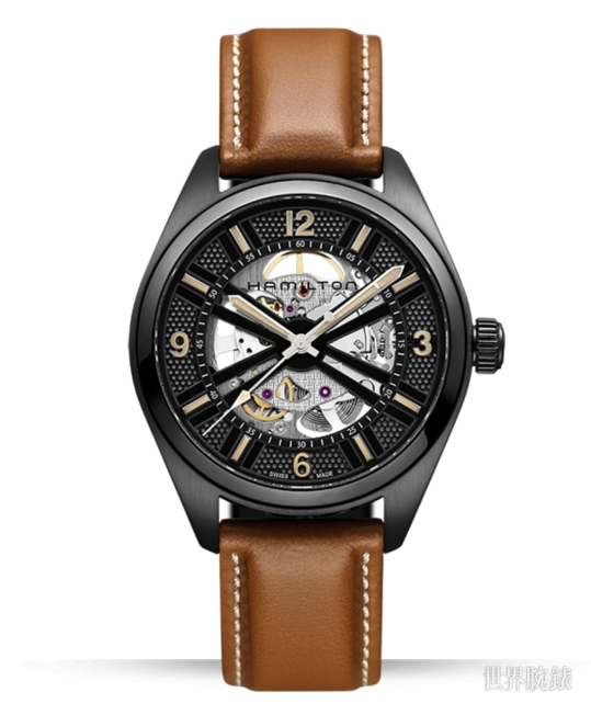 而最讓人印象深刻的當屬它的鏤空錶盤,如前言所說,錶盤的內圈的蜂窩狀圖案深具特色,可以說是極罕見的創意,讓人不得不讚賞一番漢米爾頓的巧妙創思。另外一個值得細細觀賞的特色就在於它那與錶盤重疊的“X”螺旋槳形狀,而且透過鏤空錶盤還能欣賞這枚H-20-S自動上鍊機芯,上述這些特色都為佩戴者打造出了豐富的視覺效果,除了實用性外還能兼具觀賞性,十分超值。錶盤的指針分針與數字刻度也採用鮮明的黃色做搭配,這點確保了讀時的清晰性。大氣簡潔的錶盤讓人看著神清氣爽,也能一目了然的讀取所需資訊。這款鏤空錶搭配的棕色皮革錶帶可以說是恰到好處的組合,一方面能體現卡其系列的帥氣,另一方面也提供了舒適的佩戴度。