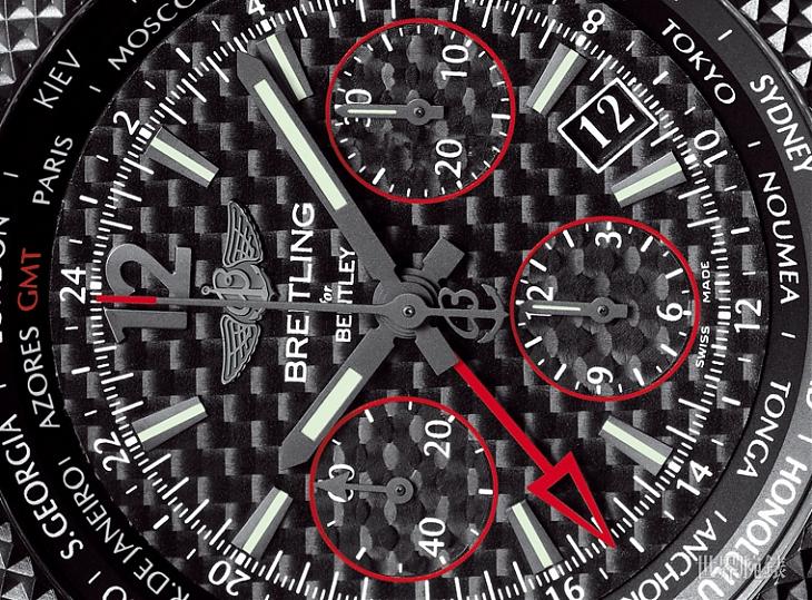 只要是百年靈的錶,其實從錶款身上都可以聞到濃濃的品牌DNA,譬如這款與高級汽車品牌賓利聯名的系列錶款,從它那象徵汽車散熱格柵的滾花紋飾開始,就帶領我們進入百年靈所編織的腕錶世界裡,從面盤的內側便安排了世界時區所代表的24個重要城市,由於和賓利聯名,當然少不了的是與速度相關的計時功能,因此位於面盤三點鐘位置的是三十分鐘計時錶盤,六點鐘位置的是12小時錶盤,九點鐘位置的則是小秒錶盤,在如此繁複的時間資訊裡,在四~五點鐘位置百年靈還安置了日期顯示,最後再以鮮明的紅色設計,分別雕琢了三個小錶盤和第二地時間指針,以此展現出競速的馳騁速度感,從面盤的整體佈局上,可以得來一個重要的結論,這就是百年靈在安排時間資訊上的深厚功力,儘管放置了如此複雜的時間資訊,卻還是透過簡明扼要的設計讓錶友可以直覺辨識時間,所以百年靈無論是在功能還是外型上,依然無庸置疑地得到不少內行人士的支持。