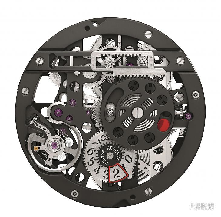 這只全新錶款搭載宇舶自製的HUB1201手上鍊機芯,該機芯具有兩枚並聯發條盒,以獨特的齒軌連結至動力儲能指示系統。藉由一組齒軌與小齒輪構成的機械裝置,兩條齒軌滑動於9點鐘到3點鐘的橫軸上。另外,這只錶所搭載的創新雙重動力儲能顯示功能,它的設計靈感源自Meccano建構式機械積木玩具。透過這只錶的開放式面盤,還能展現HUB1201手上鍊機芯的機械結構,以及不同凡響的齒軌驅動10日動力儲能顯示。其一於3點鐘位置,在機芯動力的最後兩天會逐漸顯露紅點,而6點鐘位置視窗中顯示0-10動力儲存的剩餘天數。另外,7點鐘位置的擺輪律動之姿,以及9點鐘位置的小秒盤都能一覽無遺,盡收眼底。