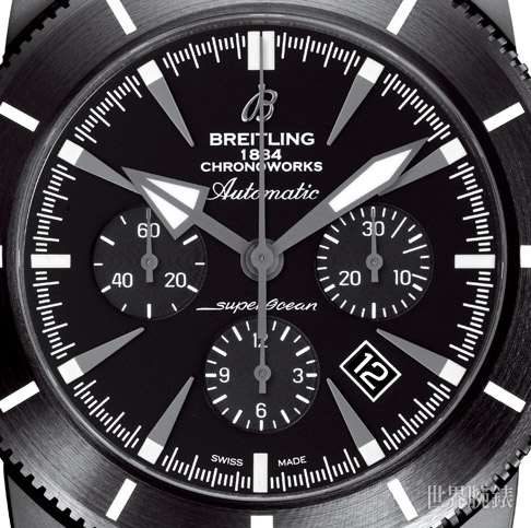 ▲黑白分明的面盤設計,百年靈額外放大了時分針並承載更多螢光材料,突顯了時標與附帶功能的讀取性。