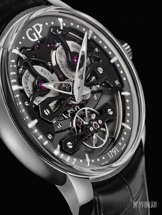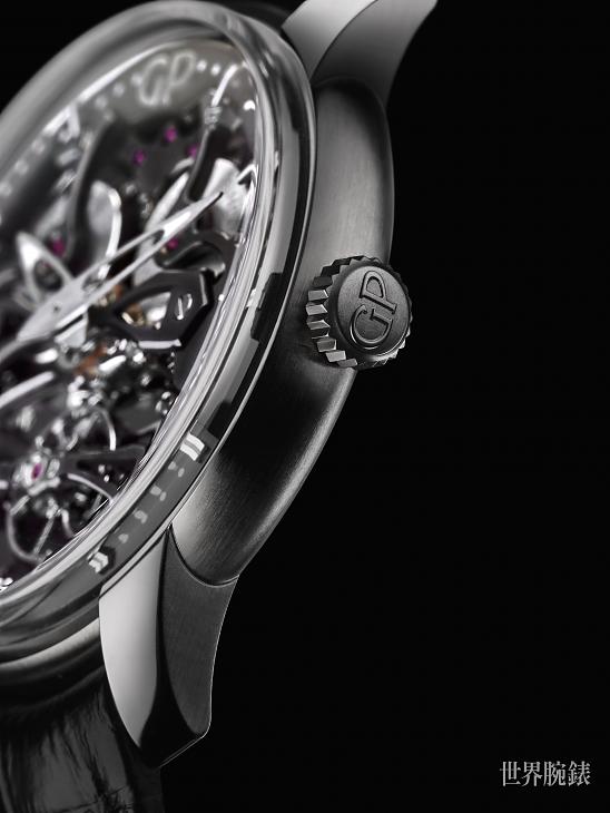 這只鈦金屬腕錶搭載GP08400 自動上鍊機芯(14 ¼ 法分),配以直徑 45 毫米的鈦金屬錶殼,防水度達 30 米,搭配黑色鱷魚皮錶帶且以鈦金屬製成的三疊式錶扣牢牢固定。這枚機芯有著完美的對稱感,微型自動盤也與發條盒鑲嵌於同一軸線之上,賦予機芯長達50 小時的動力儲存。