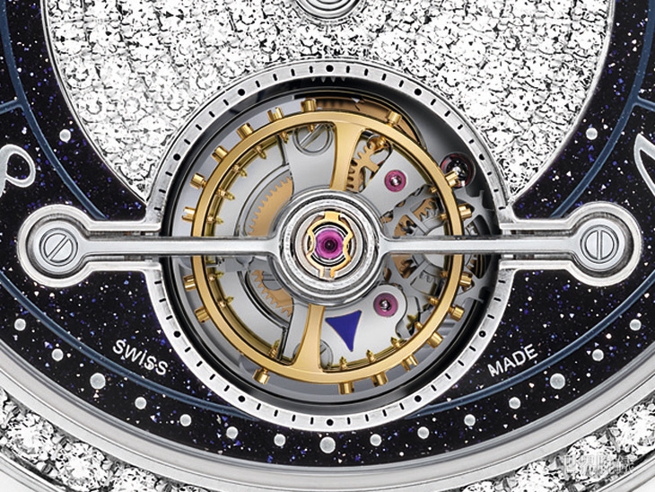 相較於2016年發表的ExoTourbillon Slim,全新錶款全身經過精細裝飾,呈現優雅格調和非凡工藝。面盤以以璀璨的深藍色砂金石製成,中央同心密鑲144顆明亮型切割鑽石,錶圈鑲嵌58顆漂亮的頂級Wesselton鑽石。橋板及微型自動盤均刻有"en éventail"日內瓦波紋圖案,鍍銠陀飛輪橋板經鏡面拋光處理,主夾板經緞面處理,微型自動盤下方的夾板則飾有太陽紋。面盤裝飾酷繁星閃爍的夜空,雙色調的強烈對比呼應品牌精湛工藝與深厚專業知識的結晶。