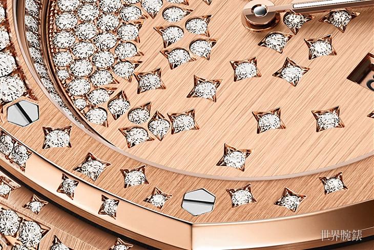 18K玫瑰金材質/石英機芯/時、分、日期顯示/錶款鑲鑽541顆,約重3.23克拉/藍寶石水晶鏡面/防水50米/錶徑33mm