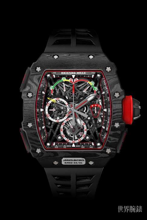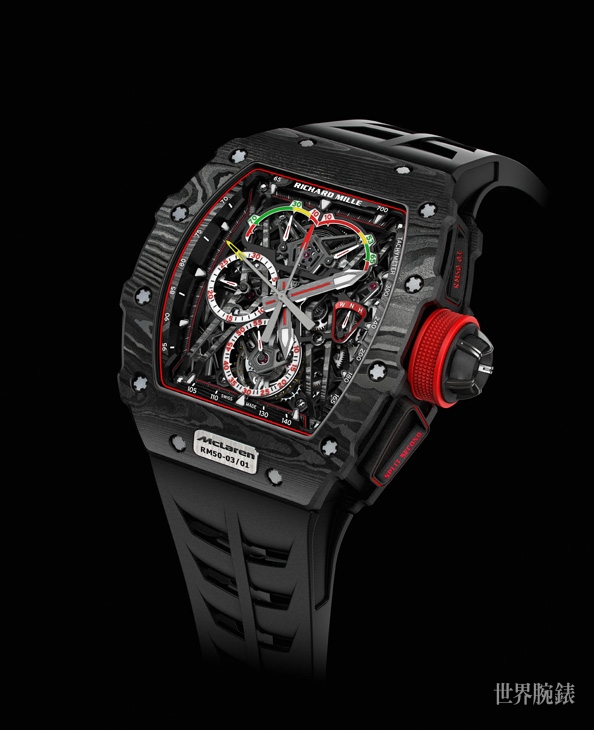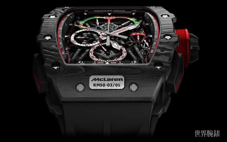 RICHARD MILLE與一級賽車方程式製造商McLaren一拍即合,為2017年SIHH聯手帶來RM 50-03雙秒追針陀飛輪計時錶。它號稱是史上最輕的機械計時錶,整只錶款連同錶帶重量不足40公克,RM應用最前沿技術材料融入到錶款的製作中,實現了超越極限的機械性能。