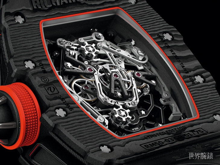 RM 50-03的超輕祕訣在於得到了McLaren的應用技術,將一種叫Graph TPT™(俗稱石墨烯)的全新材料引用到錶款的製造中。石墨烯作為一種革新的納米材料,重量比鋼輕6倍,但強度卻是鋼的200倍,它能夠大大增強了碳纖維的物理特性。McLaren研究將之整合到他們的一級方程式賽車當中,RICHARD MILLE從中得到啟發,看到此技術應用的可塑性。於是,品牌將石墨烯實際運用整合到TPT™碳纖維中,從而生產出Graph TPT™。Graph TPT™在各方面無可匹敵,擁有超高的抗震、抗腐及超輕的特性。連同搭載的機芯也只有7克重,使用了5級鈦合金和TPT™碳纖維打造的底板和橋板,以及極盡鏤空的部件。一條TPT™碳素鋼造的橫向保持架,附在錶環上,支撐整個機芯結構。不需要錶殼襯圈,造就了機芯和錶殼之間完美的配合。