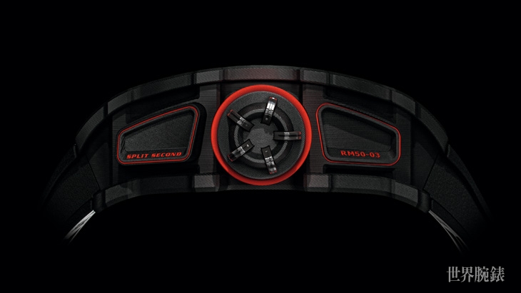 RM 50-03備有雙秒追針、陀飛輪裝置和計時碼錶多項複雜功能。陀飛輪擒縱結構與雙秒追針裝置的結合能高能量傳遞,以及減少摩擦,為錶款得到最優化的效果。而配置的全新雙秒追針設計使計時碼錶的能量消耗減少了50%,同時還減少了軸間的摩擦,保證完美的共時運動、良好的功能鎖定和高度的穩定性。