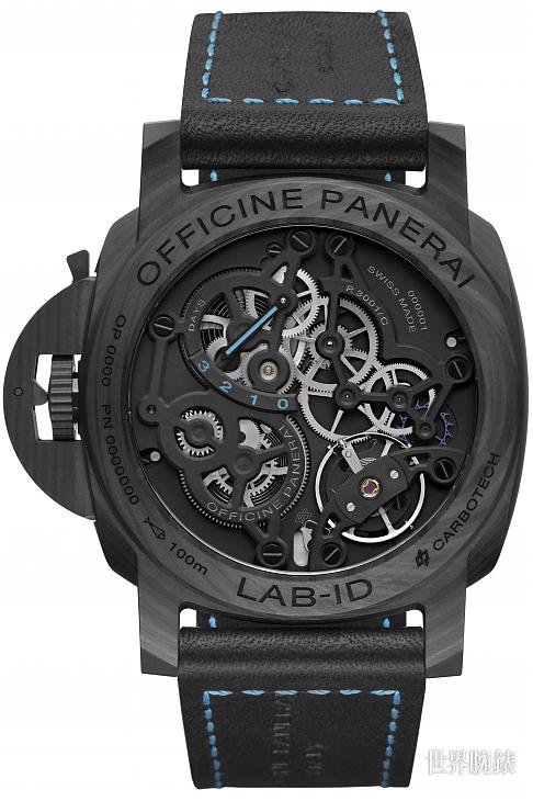 LAB-IDTM PAM00700搭載P.3001/C手動上鍊機芯,動力儲存長達三天,更首次推出嶄新的半鏤空設計,完全無需添加潤滑劑,而且只需鑲嵌四顆寶石軸承即可流暢運作。它也結合碳的獨有特質,令夾板、橋板、發條盒、 擒縱裝置及抗震裝置都以能自行潤滑及乾燥的物料組成,因此無需添加任何液體潤滑劑。正是有這些設計,沛納海推出這只LAB-IDTM PAM00700的同時也做出了至少保固50年的保證。LAB-IDTM PAM00700的底蓋幾乎讓整枚P.3001/C機芯展示人前,同時方便使用。它搭配黑色皮革錶帶,錶帶飾以與面盤藍色夜光細節同色的撞色縫線。