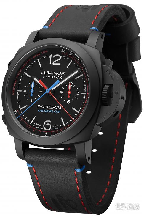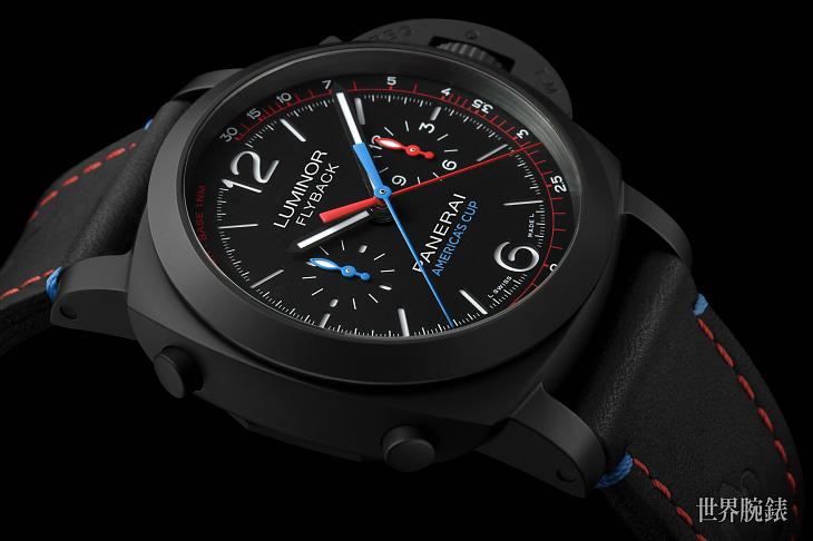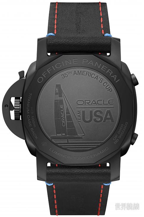 Luminor 1950 美國官方代表隊3日鍊飛返計時錶 (PAM00725) 限量發行200只,搭配黑色天然無加工皮革錶帶,這是為美洲盃帆船賽所量身訂製的,能體現競賽精神的同時,其錶帶兩面也均熱壓美洲盃帆船賽的標誌,並飾以對比強烈的藍、紅兩色雙縫線。