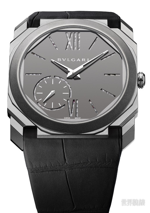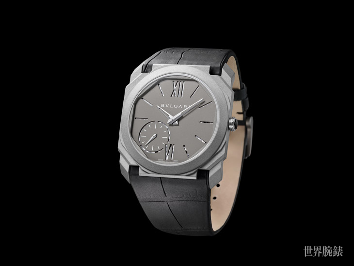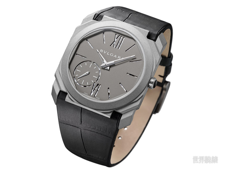 全新限量版Octo Finissimo的厚度僅5.15毫米,非一般的輕盈度讓品牌在纖薄時計範疇確立一個新的里程碑。新Octo Finissimo採用鈦金屬打造錶殼與一體成型的霧灰色面盤,再搭配黑色鱷魚皮錶帶,營造出極酷造型。