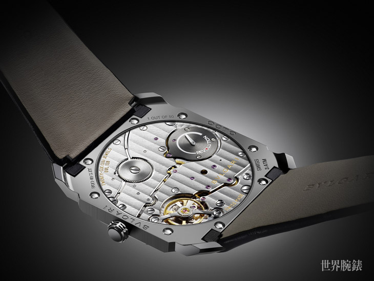 Octo Finissimo之所以能保持在5.15毫米的厚度,背後要歸功於超薄BVL 128機芯,只有2.23毫米,成就了錶款整體的淺薄度。機芯共有26顆寶石軸承,每小時震頻28,800次(4赫茲),機芯裝飾美輪美奐,以講究手工藝的圓形雕紋、倒角和日內瓦刻紋裝飾。