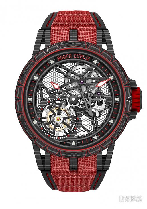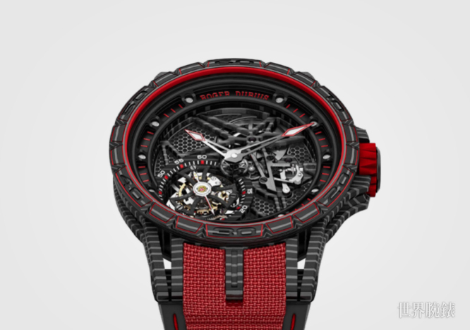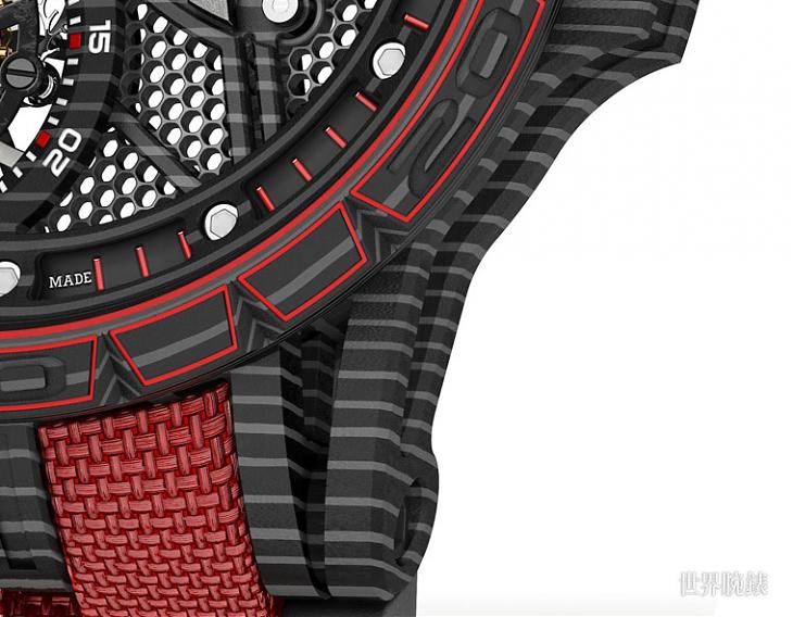 此工藝使得機芯與錶環能夠具有相同的圖紋。 這款以28只專賣店限量款形式發行的Excalibur Spider Carbon碳纖維腕錶,其黑色橡膠框架上嵌入了紅色RubberTech仿織物工業面料, 並由覆蓋DLC塗層的鈦金屬錶扣固定,不僅輕巧握住了人們的手腕,也營造出令人血脈賁張的運動性格。