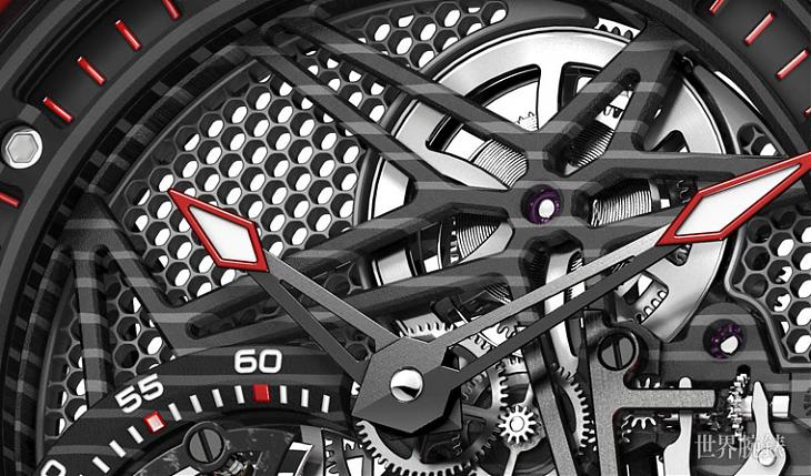 特別的是,此腕錶的機芯功能雖然是羅杰杜彼近年常見的設計,但其包括主夾板、橋板和陀飛輪上部框架全部以碳纖維材質製造,形成一組輕巧並富有特色的時計結構。