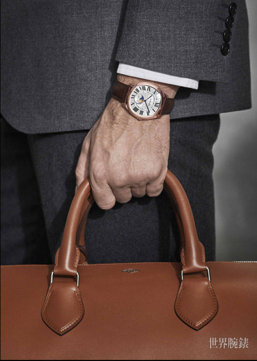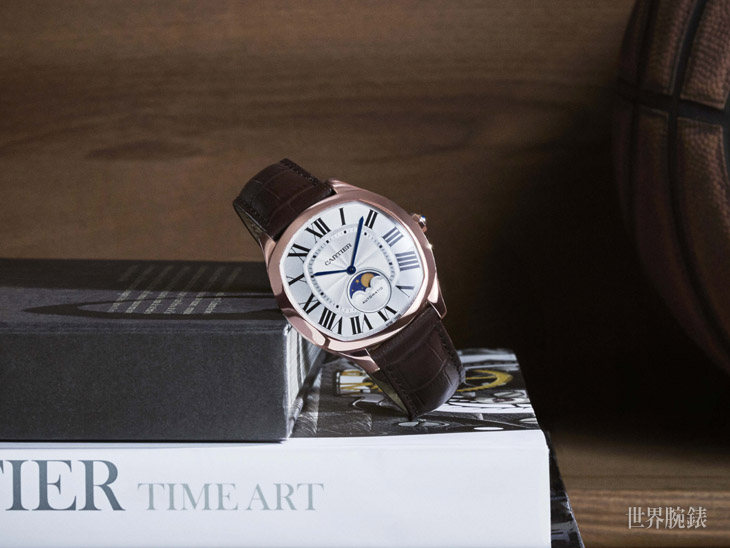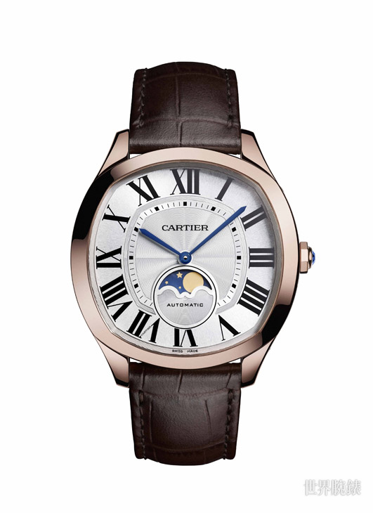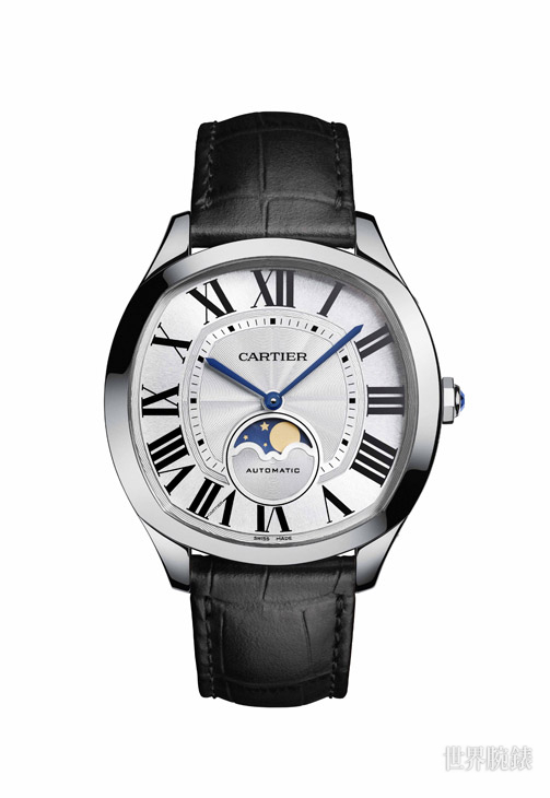 Drive de Cartier月相錶延續系列美學理念,以顯著個性演繹Drive de Cartier男士自由不羈、無拘無束的格調。面盤飾以簡約白色扭索雕紋,錶殼線條圓潤搭配略微拱起藍寶石錶鏡,提供舒適自然的佩戴體驗。這只錶款搭載1904-LU MC機芯,6時位置設月相顯示。這項複雜功能準確呈現新月、上弦月、滿月、下弦月交替的時刻。其擁有「天文」級別的精準品質,每125年才需校正一次。Drive de Cartier月相錶備有玫瑰金和不鏽鋼兩種款式,玫瑰金版搭配咖啡色鱷魚皮錶帶,而不鏽鋼版則搭配黑色鱷魚皮錶帶。