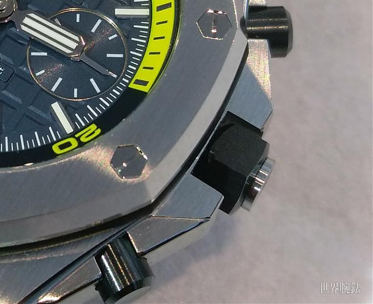 不過跟潛水錶的情況正好相反,過去離岸型的一般款都是計時碼錶(除了少數小徑的女鑽錶),因此這款乍看之下有可能會讓人誤認成是一般42mm的離岸型。其實一般款跟潛水錶最大的差別就是在於潛水錶增設了內旋式的計時圈,而錶殼的10點鐘也因此多了一顆操作計時圈的錶冠,但除此之外這款的錶殼的確是跟現行的42mm一般款幾乎如出一轍,幾處關鍵的辨識點,像是按把護橋的形狀,也都跟42mm的完全一樣。