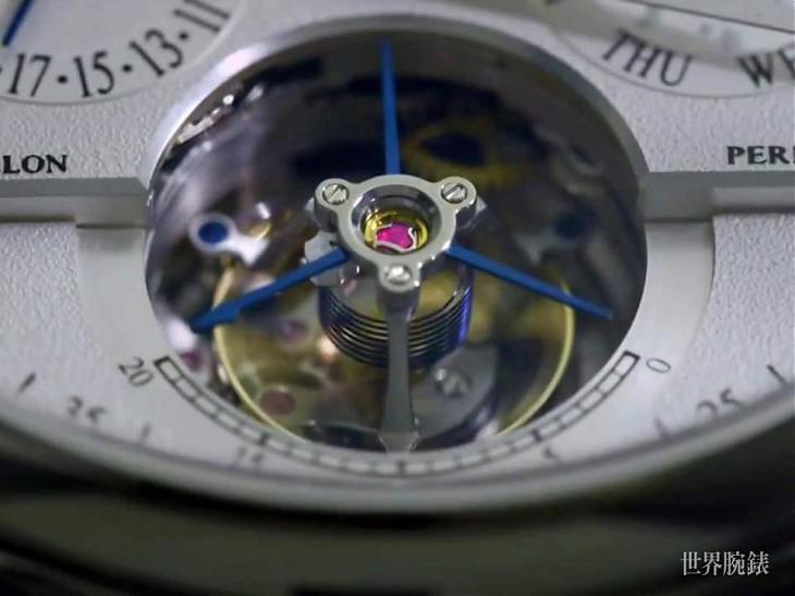 ▲採用柱狀游絲、有高度立體化的籠架的陀飛輪,彷如懸在空中的樣態顯得更為動感,也是整只錶最為吸睛之處。