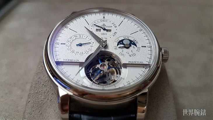 這只萬年曆圓柱游絲陀飛輪,是積家為慶賀創立180週年特別推出的錶款;同時,也是向品牌創辦人安東尼.勒考特(Antoni LeCoultre)致敬。「第一眼看到這只鉑金款時,就覺得它的外型好美~」積家強調錶殼在製作上必須絕對的精準,從針對不同材質零件進行塑模開始,到車削、銑削和調整,以及細緻的手工製作、倒角、拉伸、打磨和拋光等工序,任何細微的小瑕疵都不放過,造就出令人驚豔的錶殼。「細看會發現面盤上的顆粒狀飾紋和其散發出的光澤感,與眾不同。」Howard認為,這款腕錶的面盤採用梨地紋的粒面表面處理,使腕錶變得更為優雅。面盤外圈的刻度、時標及太子妃式指針,皆從19世紀的懷錶汲取靈感,襯托出腕錶的古典風格。