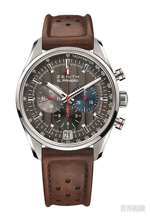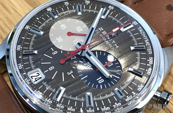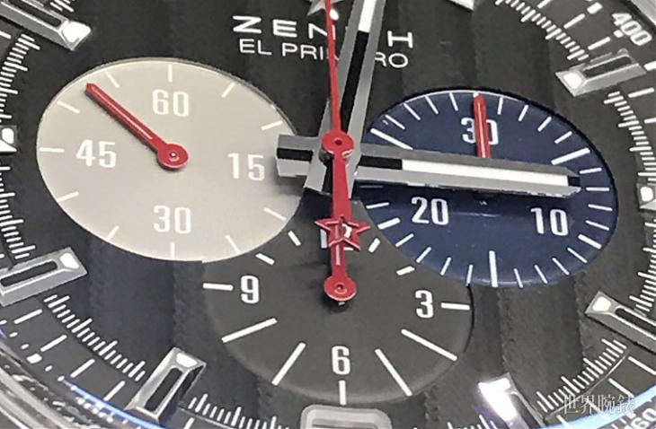 日內瓦波紋一般被作為機芯表面的飾紋處理,這次ZENITH將其用來作為面盤表面的飾紋處理,其實這不論在外型美觀上,或者品牌DNA上都可深刻理解為何採用這樣的設計,因為傳奇計時機芯El Primero就等於ZENITH的代名詞,使用本來用於機芯上的飾紋作為面盤表面的處理,一來再次突顯了傳奇機芯的存在感,用來提示錶迷錶款本身所蘊含的品牌DNA;二來在外型上更是加分不少,恰好與置於面盤下半部的三眼三色錶盤做出層次性的區隔,也使得錶款在視覺上增加了不少細節的設計,值得讓人回味再三,加上立體時標與經典的測速刻度,以及紅色計時針的用色處理,錶款每一細節都在在提示錶迷深藏在其背後的計時精神與競速因子。