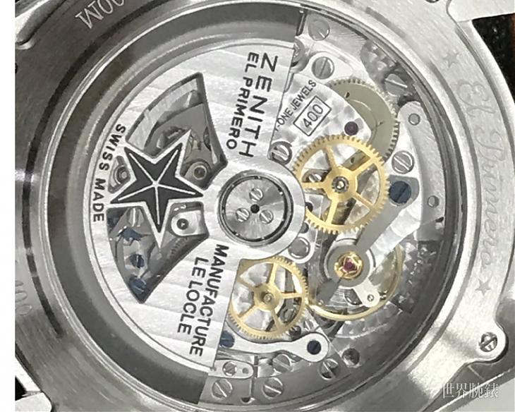 新款所搭載的El Primero 400B計時機芯,繼承了傳奇機芯所擁有的高震頻36,000vph,這是讓不少機芯控所愛的極致製錶展現,因為其計時顯示可精準至1/10秒,所以這款機芯之所以傳奇,便在於此,而新款El Primero 400B計時機芯除了在高震頻上有所繼承以外,其整合式的導助輪結構也是源自1969年機芯的結構,所以移植自史上有名的計時機芯的優異之處,加上後來ZENITH更是精益求精,自2014年起將矽材質也用於擒縱結構上,並使用鈦金屬作為基板與夾板,使得這款蛻變至今的傳奇機芯更為強大,也使得El Primero系列成為目前品牌獲得大獎最多的機芯之一,傳奇名號堪稱實至名歸,耐用、高震頻又是計時碼錶的代名詞,是一款不可多得的優異機芯。