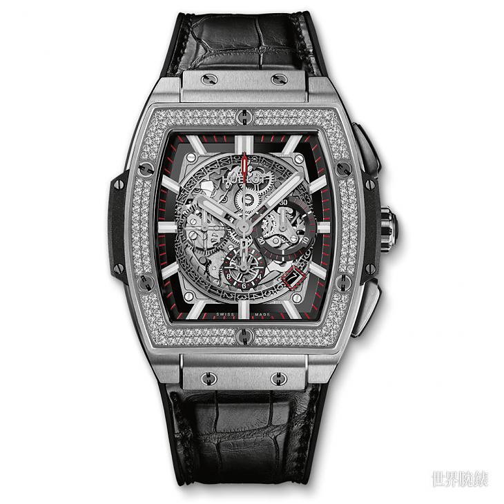 以鈦金屬材質打造的Spirit of Big Bang鑽錶,其錶殼經過鍛面、拋光和微珠噴砂處理,因此看上去有著上乘的質感。它搭載HUB4700自動上鍊機芯,動力儲存長達50小時,並具備計時碼錶功能。而它的鏤空面盤應該就是整只錶最引人注意的地方。透過其鏤空面盤,佩戴者可以靜靜地欣賞機械的運轉時光,這無疑是種享受。面盤上的鍛面鍍銠嵌入式刻度和指針皆覆有白色塗層,這也使得視覺效果更加立體與豐富,同時塑造出一種堅毅的形象。此外,面盤三點鐘位置設有分鐘計時盤,六點鐘位置則設小時計時盤,九點鐘位置設小秒盤,而日期顯示會藉由紅框指示,算是十分特別。而鑲有雙排明亮切割鑽石這一點也為這只錶增添耀眼的光芒,並且讓它看上去有著奢華的美感。最後,這只錶可搭配黑色橡膠錶帶或是鱷魚皮錶帶。