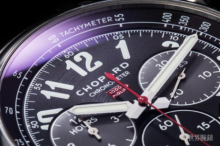 ▲"1000 Miglia"的紅色箭頭Logo是Mille Miglia的一大特徵,2014年式是將Logo放在3點的小秒盤內(那一代裝的是2894),這款則是將它移到了12點的品牌名稱下方。