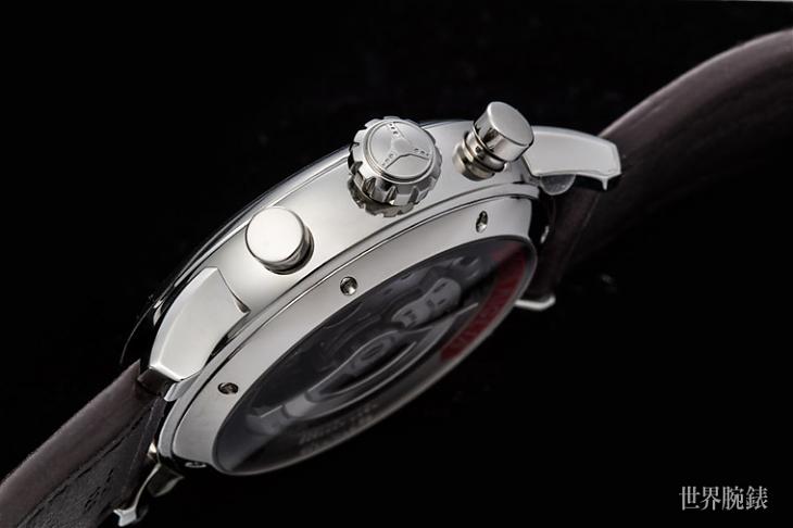 ▲錶冠的切面是方向盤的造型,這也是Mille Miglia的重要識別之一,雖然輪廓簡單,但三輻打圓孔的造型仍然充分表現出古董車的風格。圓柱針筒型的按把同樣適合復古賽車錶。