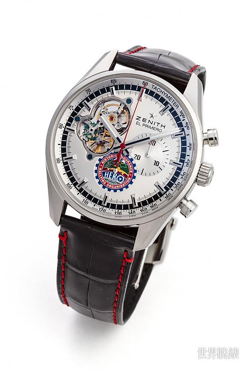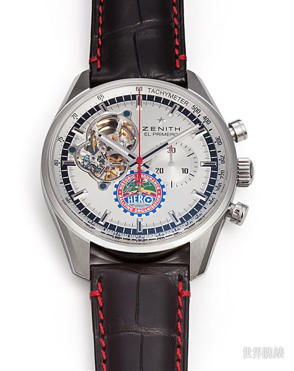 這款特殊版的El Primero Chronomaster 1969是ZENITH跟HERO的聯名款,錶款基本上維持了Chronomaster的設計,不過在6點鐘的12小時計時盤上印上了HERO的Logo,除此之外還有若干細部修改;類似的聯名款還有SVRA(跑車古董賽組織)特殊版,兩款的改款邏輯相同,所差者唯有下方的Logo是SVRA的。原始錶款有一個很重要的特徵就是多色的子面盤,這是從1969年的初代El Primero延續下來的,面盤上的3、6、9三個子面盤分別是藍色、鐵灰和淺灰色;Chronomaster系列由於9點鐘做了開面所以原本沒有淺灰色的子面盤,HERO聯名版又將6點的換成了組織Logo,所以實際上只剩下3點的盤面可以維持原始設計,只是或許考量到不想搶走HERO Logo的焦點,所以這款索性連3點的都改成了跟主面盤相同的銀白色。