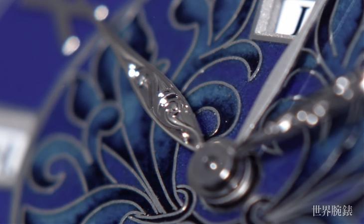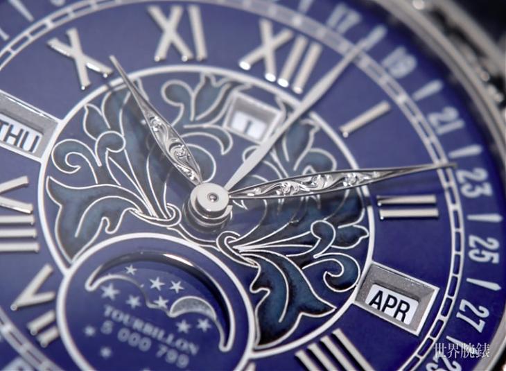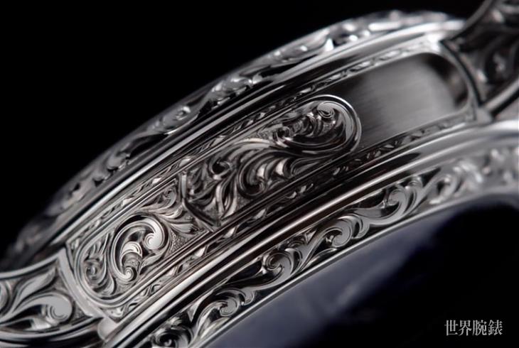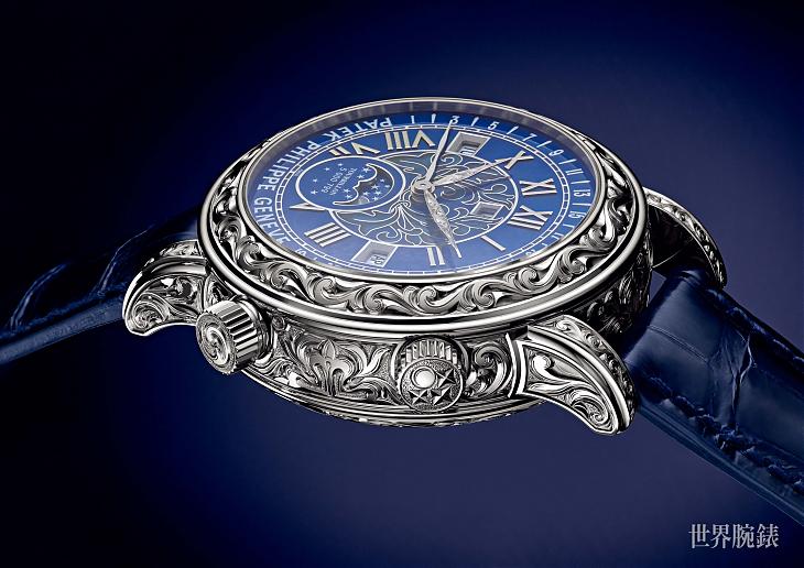 除了多重複雜功能,Ref.6002引人入勝的地方在於灌注百達翡麗所傳承的日內瓦七大技藝傳統。其以纖薄金質圓盤重新打造面盤,從軌道式刻度、萬年曆視窗與面盤中央的飾紋皆以立體浮雕塑型,結合了掐絲與內填琺瑯工藝,營造出豐富面盤層次。不同色調的藍色琺瑯成為面盤主色,如細膩的月相盤運用了白、灰、黑色琺瑯漸層處理。不僅如此,精美奢華的錶殼裝飾也令人歎為觀止,品牌工匠以一塊白K金原料精雕細琢,以百達翡麗代表性的Calatrava十字星為主軸加以延伸,藉由銳利的雕刻刀與鑿刀賦予錶圈、錶殼、錶冠、三問報時滑桿與錶耳有別以往的嶄新生命力,雕刻裝飾所用的工時超過100工時以上,流暢細膩一氣呵成的紋飾彷彿是件腕間雕塑逸品,整只錶簡單來說就是美得讓你不要不要的。