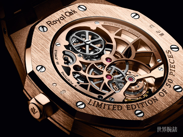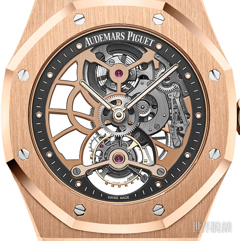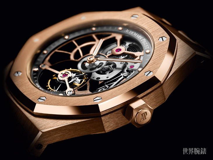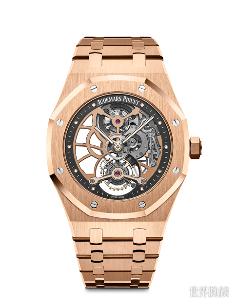 ▲原創的皇家橡樹超薄鏤空陀飛輪腕錶先以鉑金材質示人,後來也推出過K金款式,如今終於推出玫瑰金和不鏽鋼材質,經典特色依舊風采不減。