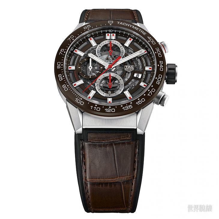 全新的Heuer-01計時碼錶仍舊是我們熟悉的樣貌,也搭載著Heuer 01自動上鍊機芯。Heuer-01計時碼錶搭配拋光陶瓷測速刻度錶圈,閃爍著亮彩的光芒。錶殼則是以拋光和精細磨砂不鏽鋼材質所打造的組合式錶殼(由12枚零件組成),因此錶圈與錶殼的搭配可說是相得益彰。此外,佩戴者也能透過Heuer-01的標誌象徵——鏤空面盤以及藍寶石水晶底蓋一覽腕錶內部的精巧結構。看到底蓋方面,奪目的鏤空紅色導柱輪位於中央。而它的計時碼錶橋板、黑色PVD塗層圓形自動盤也形成震動齒輪離合器系統,這一切可說十分的精細絕妙。另外,從Heuer-01也能發現它與賽車活動互相呼應的血統,我們可以看到Heuer-01的中央秒針、30分鐘計時盤、12小時計時盤、開始/停止按鈕,皆以紅色標記,不只突顯了賽車的DNA,也展現了濃烈的運動風格。這款全新Heuer-01計時碼錶也將於2017年六月推出,參考價為5,350瑞士法郎。