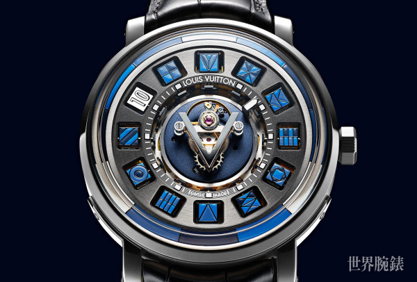首先,Escale Spin Time陀飛輪腕錶最具標誌性的特色莫過於它的時間顯示方式。它透過12個旋轉方塊轉動顯示時間,取代了傳統的指針顯示,創造耳目一新的時間顯示。中至陀飛輪原本就是比較少見的設計,此外,透過這個獨具一格的設計,面盤中央的陀飛輪也好似懸浮於腕錶中心,塑造出更加震撼的視覺效果。更重要的是,這個飛行陀飛輪與Spin Time旋轉時間顯示的嶄新組合也是首次出現於品牌製錶歷史中。還有一點值得注意的便是這個陀飛輪的外型,想必大家都注意到了,這個陀飛輪以V字型呈現。這樣的設計靈感乃是源自於Gaston Vuitton於1901年設計的Steamer Bag手提袋上的大V字裝飾。由此見,這只Escale Spin Time陀飛輪腕錶算的上十分呼應路易威登的品牌精髓。