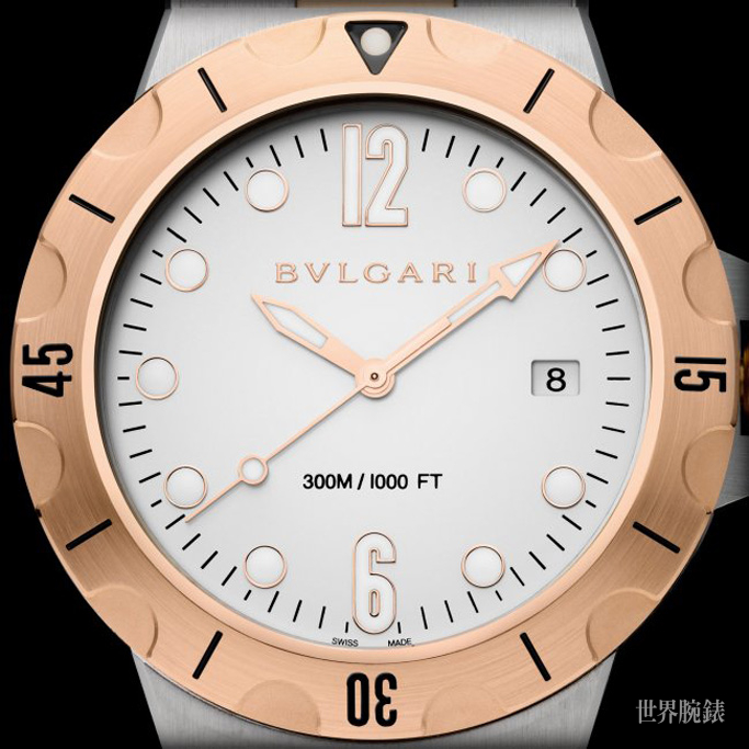 與上一代的Diagono Scuba最明顯的差異是寶格麗此次除了選用不鏽鋼材質,也帶來了18K玫瑰金半金材質的Diagono Scuba,並且可自由搭配橡膠錶帶或18K玫瑰金雙色鍊帶。就以全新面貌的18K玫瑰金錶殼搭配同材質雙色錶帶款式來說,41毫米的玫瑰金旋轉錶圈帶有凹凸有致刻痕設計,並以鮮明的黑色阿拉伯數字清楚標示潛水與減壓時間。雙色搭配下的Diagono Scuba集現代感、都會感、熱愛冒險的特質於一身,在展現優異性能的同時也絲毫不犧牲設計風格。