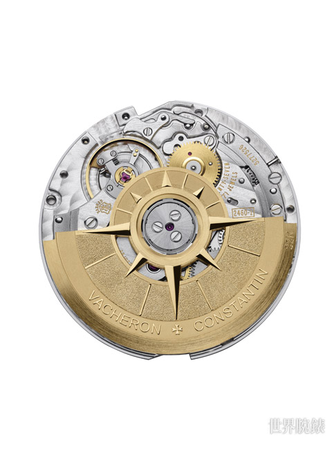▲由江詩丹頓自行研發製造的2460 WT上可看見22K金質自動盤飾有為旅行者指引方位的風向玫瑰羅盤圖案,讓旅行家的精神不管於時間或在空間中都不會迷失。