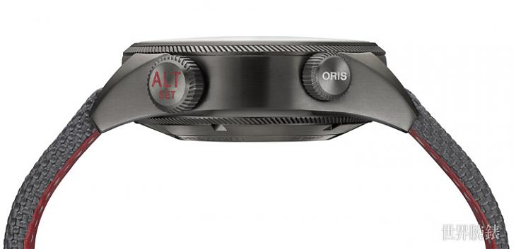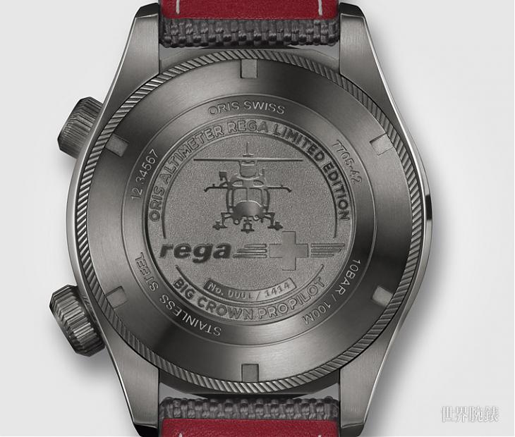ORIS Altimeter Rega限量版腕錶,內置機械氣壓高度計,能夠清晰靈敏的指示當前氣壓和高度。 47mm不鏽鋼錶殼外覆霧面灰色PVD鍍層,搭配灰色合成纖維錶帶。錶帶的牛皮內襯為鮮豔的紅色,折疊錶扣亦採用灰色PVD不鏽鋼材質。面盤9點位置印有紅色Rega標誌,實底蓋銘刻Rega救援直升機圖案和限量編號。腕錶限量製造1,414只,該數字正是Rega在瑞士境內的緊急救援電話號碼。