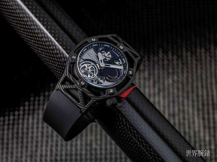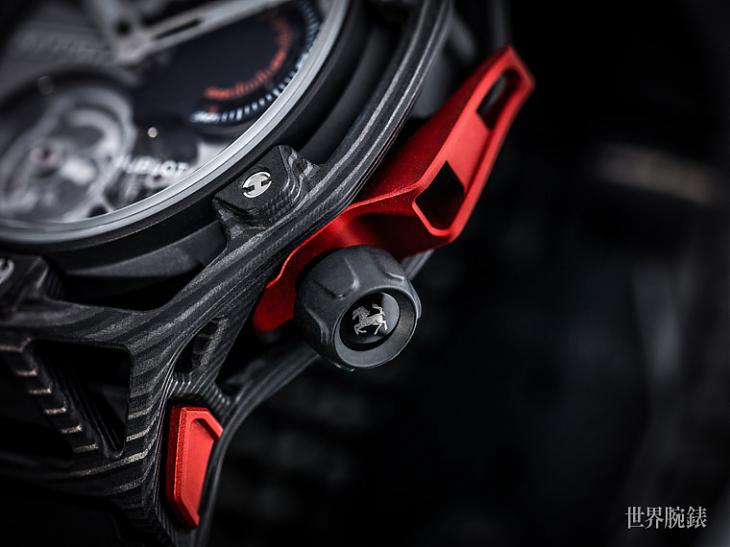 ▲錶款奠基於法拉利超跑風格打造出獨一無二的錶殼造型,同時除了王金與鈦金屬款式外,品牌也製作出與賽車密切連結的PEEK Carbon聚合物碳纖維錶殼,兼具輕量化和耐用度,表面紋路也相當具有特色。
