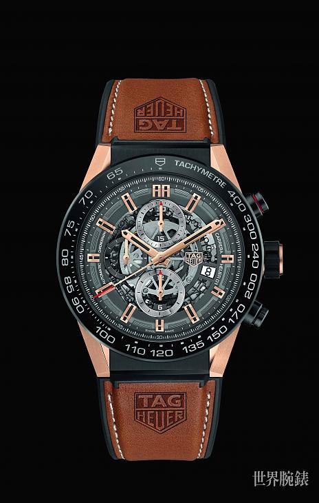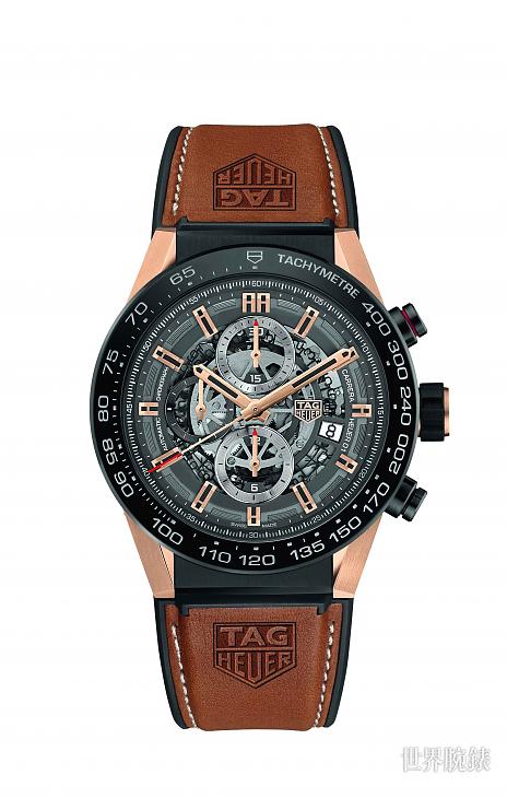 豪雅這款全新自製的Carrera Heuer-01玫瑰金計時碼錶擁有Heuer-01原創腕錶的所有特點,包括如今已成為該系列象徵的鏤空面盤。另外,這只計時錶本次也改用鈦金屬材質製造其45毫米的錶殼,以及帶有測速刻度的錶圈。同時,為了彰顯腕錶的奢華氣息,錶耳、指針及時標均採18K玫瑰金。結合全粒面小牛皮錶帶與壓印於錶耳附近的TAG HEUER品牌標誌,展現既優雅又動感的面貌。