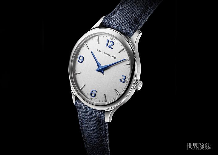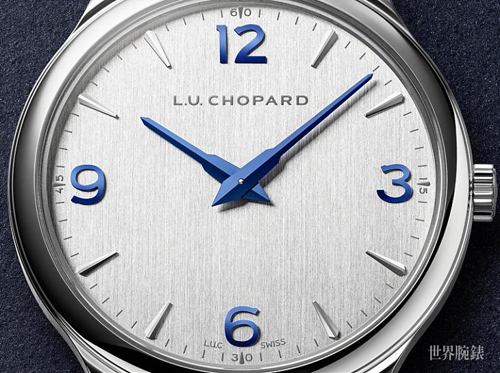L.U.C XP腕錶銀色面盤上精緻細膩地裝飾著垂直緞紋質感,鑲上造型細緻的立體時標及大方時尚的藍色調阿拉伯數字時標,太子妃式指針也是同樣的藍色調,與之呼應搭配。錶款擁有簡約精鍊且具設計感的新面貌。直徑40毫米的錶殼以不鏽鋼打造,這種堅固的材質不僅持久耐用,同時也容易搭配,且佩戴舒適。堅硬的不鏽鋼再配上以藍色羊絨編織而成的柔軟錶帶,錶帶內襯手工縫製棕色鱷魚皮,這款羊絨錶帶首次出現在L.U.C系列,另外L.U.C XP腕錶也可搭配藍色鱷魚皮錶帶。