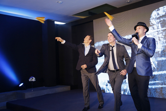 ▲ 百年靈大中華區總裁David Reid和John Travolta一起放飛百年靈紙飛機