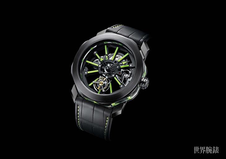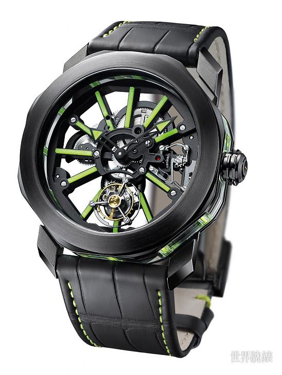 藉由透明錶背與面盤的設計,錶殼44mm採鈦金屬製成,經黑色DLC類鑽碳鍍膜處理,供錶迷盡覽腕錶內部的機芯運轉。搭載BVL 206手動上鍊飛行陀飛輪機芯,腕錶中心置入11個黑色DLC類鑽碳鍍膜處理的錶橋以及 ITR2單一複合材質的綠色條板,以奈米碳管粒子組成,亦加入了硬度有如金屬的SLN,此高科技夜光塗料賦予腕錶在夜晚釋放出白天所吸收的光源。錶橋構成時標的設計,為嶄新原創特色。因此能適當給予機芯良好的支撐,同時也扮演時針與分針的判讀機能角色,更具備裝飾功用,成為該款腕錶獨樹一幟的標誌。