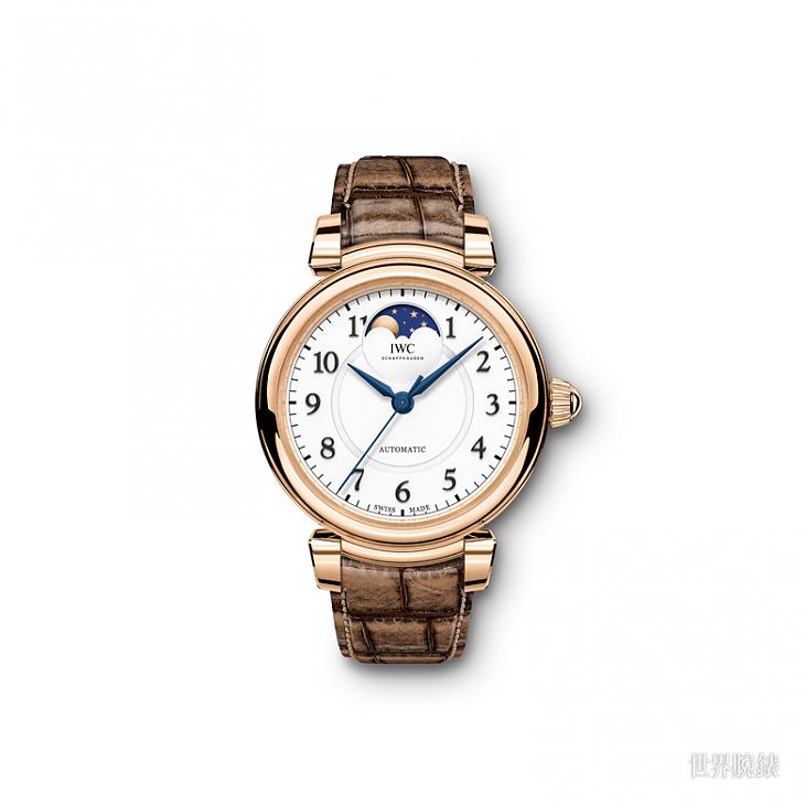 接著,我們來看到達文西月相錶,一共推出玫瑰金款與精鋼款,而錶徑皆為直徑36毫米。這款月相錶搭載35800自動機芯,其中央秒針可被掣停,以設定時間。它那階梯式內圈以及鍍銀面盤也更加突顯了圓形造型,而它的月相顯示則設於12點鐘的位置,金色/藍色的月相顯示為這一和諧的整體畫面畫上點睛之筆。雖然月亮的實際運轉週期為29.53天,但經典月相盈虧設計的齒輪系可四捨五入至29.5天。齒輪系每天自動推動顯示盤前進一個輪齒,以正確顯示月相盈虧。根據需要,佩戴者可以藉助隨附的銷釘在「2點鐘」處更新顯示。另外,它的圓形錶冠也採用了珍貴物料,這是專為鍾情於奢華氣質與精臻技術的錶迷而設計。當然,它也具有可移動式錶耳兩角的全新錶耳令錶帶能夠完美貼服於手腕之上,佩戴舒適。另外一項特色是IWC也在達文西月相錶的底蓋鐫刻達文西的「生命之花」,這是一個具有多重重疊圓環的幾何造型,以此向其對文藝復興時期全新美感定義所做出的貢獻致敬。