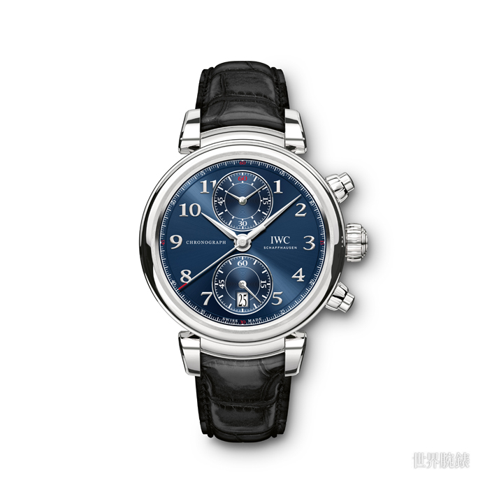 再來看到的達文西萬年曆計時錶,直徑43毫米的錶殼共有玫瑰金與不鏽鋼材質供選擇。這款萬年曆計時碼錶搭載89630自動上鍊機芯,而這也IWC首次將89000機芯系列的計時碼錶與萬年曆功能的月相盈虧顯示融合於「12點鐘」位置的小錶盤上。於同一個顯示盤上的月亮與地球陰影在小錶盤下部的鏤空下不斷旋轉。鍍銀或鍍金顯示盤顯示整個盈月,隨著深藍色圓形顯示盤部分——即地球陰影——的旋轉,月亮在視覺上呈現盈虧。深藍色背景上的白金顆粒令小錶盤好似佈滿繁星的夜空。透過計時時針與分針整合的,它記錄的時間可如同第二個時間一樣輕鬆讀取。與在第二個單獨計算器上顯示累計計時相比,這可謂是一個更為優雅的解決方案。藉助藍色計時中央指針可讀取秒鐘,精準至八分之一秒。計時碼錶擁有兩個按把,藉此可啟動、停止並歸零功能,並直接將指針重置為零( 飛返)。機芯設計使得計時功能可以持續運行,而不會對腕錶68小時的動力儲備造成明顯的損害。它所搭載的萬年曆功能以順時針顯示日期、月份和星期;四位數數字年份顯示位於面盤左下角的視窗中。日曆採用機械編排,已經考慮到不同月份的長度,甚至閏年的影響。不過由於每隔百年( 比如2100年、2200年等)會少一個閏日, 此時需要在3月1日這天對日曆進行手動調整。2300年,當前以「20」、「21」和「22」開頭的世紀顯示片要被更換成適用於2300年至2599年之間的新的世紀顯示片。整體而言,雖說這款萬年曆計時碼錶包含眾多顯示,但它的整體設計依然完美和諧,清晰簡明。