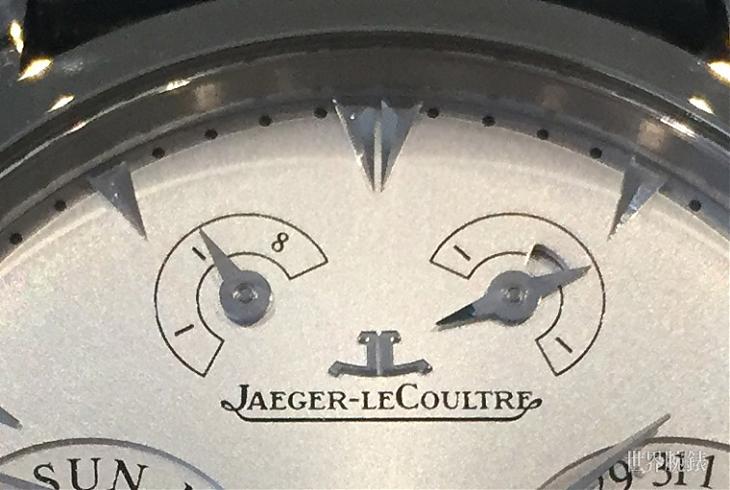 旁邊的日夜顯示也可以補充一下,它的雙頭針塗成藍色的一端代表晚上,當這一頭走進扇形區域時就表示進入夜間,跟一般的表現法不太一樣,不過理解起來還算直覺。扇形中的小窗是調校警示,其實就是日夜顯示的延伸功能,在時間走到午夜前後視窗會由白轉紅,提醒使用者現在在換日程序中,不要於這段期間進行快調。上一代的時候還沒有這項功能,這是這次新加的,現行積家的萬年曆幾乎都有類似的設計。