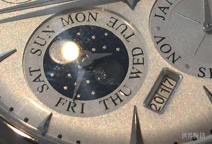 這款的月相也很有特色,它不是以月影動態遮蔽月亮的方式來表現月相,而是將月相直接印在盤面上,透過指針來指示目前月相的情形。舊版盤面上的月相有朔、望、上弦和下弦四種,這款只留下了朔望月,上下弦則以星空取代,機能方面是弱了一點(指到星空處時是上弦還是下弦要想一下),不過畫面的確變得更清爽,而且這次朔月的表現法也很可愛。