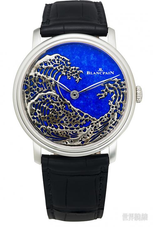 同場加映藝術大師——巨浪隱藏版腕錶,面盤以青金石搭配白K金材質,完美將神奈川巨浪打造出「靜中見動」的視覺美感,與色調變幻的神祕面盤互相輝映。在BLANCPAIN金屬雕刻師的處理下,海浪湧動的力量感和動感美與面盤上銀曜石/青金石代表的純淨和諧形成了鮮明的對比。