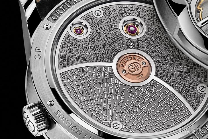 ▲錶背露出的基板上刻滿品牌所堅持的理念銘文,除了展現細膩的雕工技術之外,這些密密麻麻排列的文字也成了妝點錶背風光的加分元素。