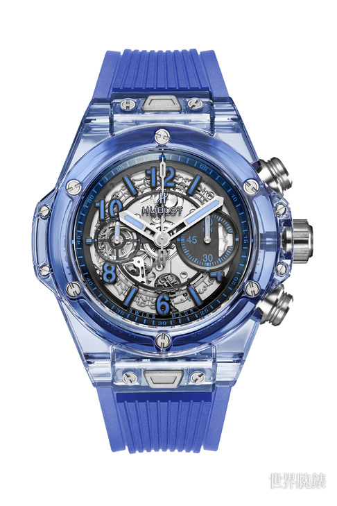藍色藍寶石材質/HUB 1242 UNICO自動上鍊機芯/時、分、小秒、日期顯示/計時碼錶功能/藍寶石水晶鏡面、透明底蓋/防水50米/錶徑45mm/限量250只/參考價:NT$ 2,616,000