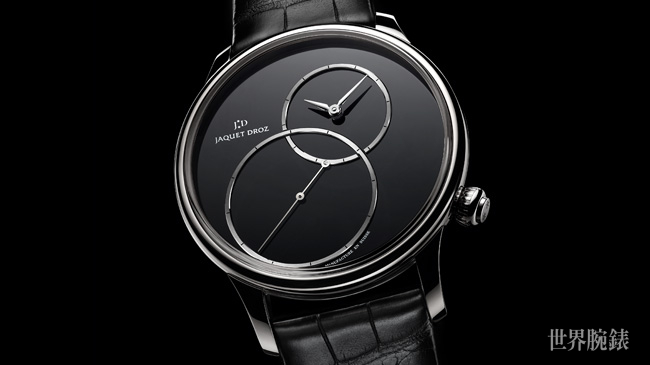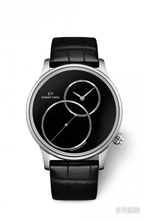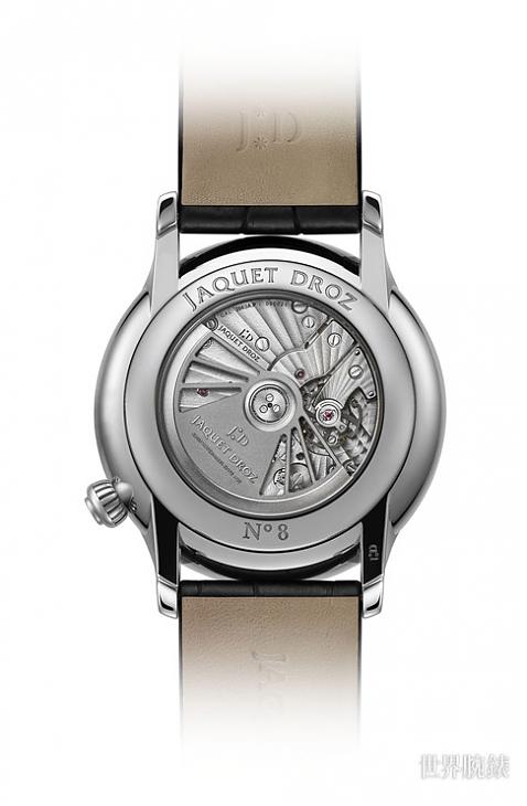 作為源自18世紀的悠久歷史品牌,JAQUET DROZ的大部分腕錶也忠於歷史,以此偏心設計為本,只是它將時分針縮小到腕錶的上半部分,卻將面盤下方的「小秒針」放大,以「大秒針」形式顯示時間。透過錶款透明底蓋的設計,機芯裝飾的日內瓦波紋集中在基板上,且為了增加視覺上的美感,自動盤也被部分鏤空,並且其表面還被精心雕刻JAQUET DROZ標誌的浮雕。錶款機芯首次進行重大變革,大膽採用矽質游絲與倒置式擒縱叉。矽的質地柔韌富有彈性,世界上僅有少數製錶廠精通使用此材料製錶。矽能很好地抵禦撞擊、溫度變化和壓力,而且不受磁場影響,性質穩定,恆久不變。雅克德羅向來也很擅長機芯潤飾,此款機芯也不例外:夾板雙面珍珠圓紋研磨;齒輪採用倒角、拋光、圓紋效果;基板部分則採用柔和倒角、直線紋路;邊角部分經手工打磨拋光,所有這些工藝都賦予機芯精美獨特外觀,透過透明底蓋,機械之美盡收眼簾。機芯表面還特別飾以扇形日內瓦波紋,機芯經精心潤飾呈現出全新的現代美感,大氣的錶橋和灰黑色調投射出更純粹的現代精神,品牌經典裝飾元素融為一體、渾然天成。