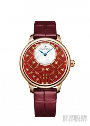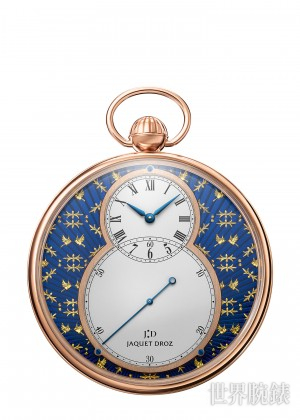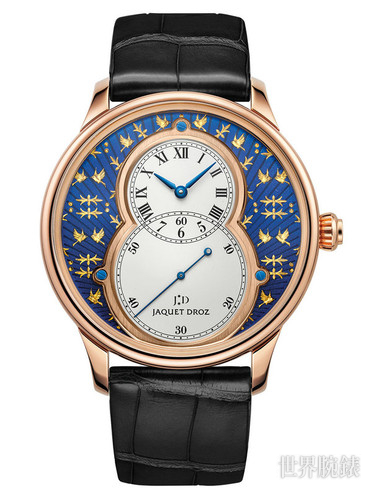 2017年,雅克德羅推出了六個標誌性錶款,全部採用這種超凡裝飾工藝,將極具歷史意義的金箔雕花工藝與現代作品完美融合,包括品牌創始人皮埃爾.雅克德羅(Pierre Jaquet-Droz)十分珍視的作品「鳥」。雅克德羅藝術家們尤其喜愛的錶款:時分小針盤(Petite Heure Minute)腕錶以更寬大的35、39和43毫米尺寸大氣展現濃郁的藍色和紅色琺瑯修飾。大秒針(Grande Seconde)系列腕錶則增加了藍色大明火琺瑯面盤款,與閃耀的金箔雕花以及43毫米直徑金錶殼相得益彰。其中一款的秒盤內還設置了能夠抵消重力影響的複雜裝置——陀飛輪;而一款懷錶讓人有幸一睹19世紀的優雅風範,為這個系列更添魔力。